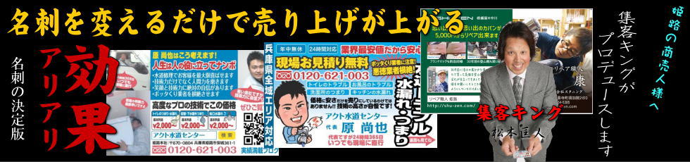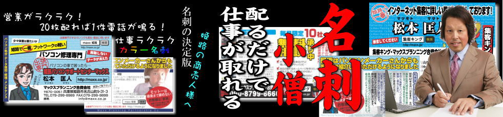 があれば、私のようにたった一人で商売をやってるような人でも、十分に武器になります。もちろん会社組織で動いていらっしゃる営業マンや、トップセールスマンを兼任する社長さん自身のご商売もこの名刺が威力を発揮してくれるのです。名刺に一工夫するだけで、あなたの商売とあなた自身をもっといろんな人にアピールできるのです。